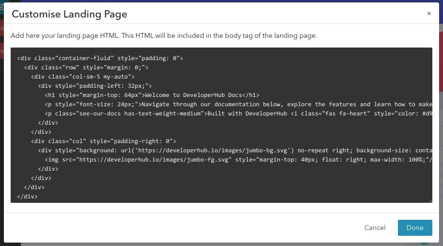 When customising the landing page, you may enter HTML that will be inserted asynchronously in your landing page.
