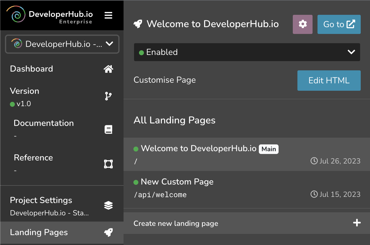 To enable a custom landing page for the main landing page: