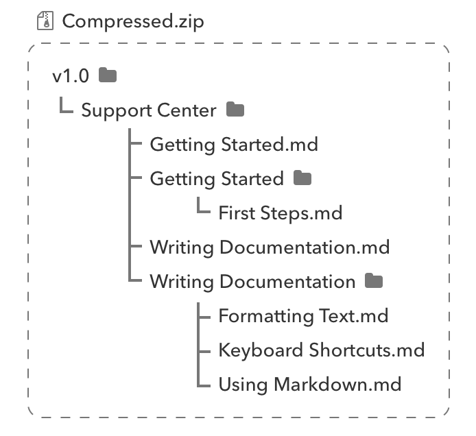 v1.0is the name of your version.Support Centeris the title of your documentation.Getting Started.mdis the title of a documentation page written in Markdown format.Getting Startedfolder indicates thatGetting Started.mdis a parent page, and it has a subpage titledFirst Steps.md.Formatting Text.md,Keyboard Shortcuts.mdandUsing Markdown.mdare all subpages of Writing Documentation page.