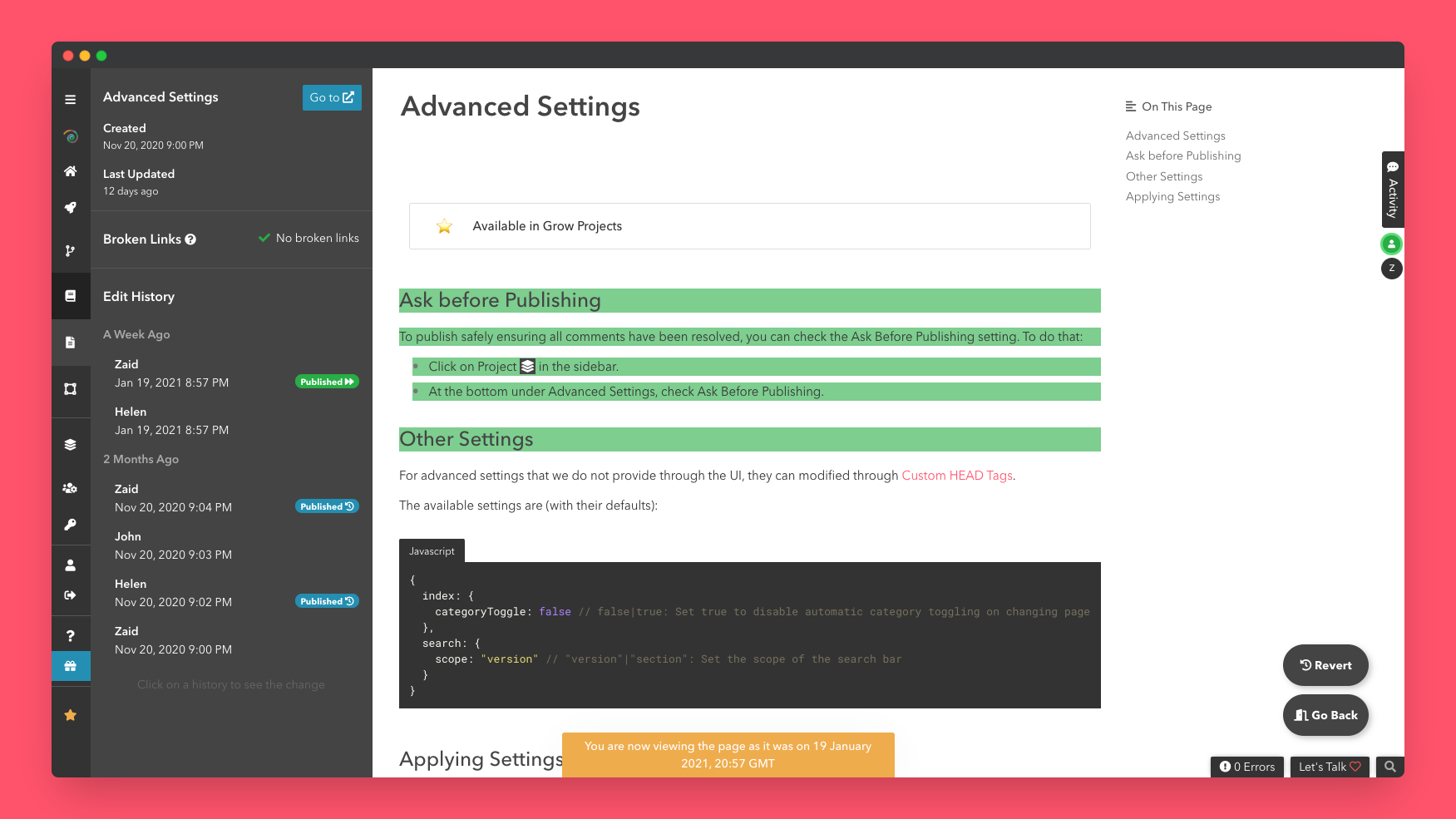 - On clicking on an edit history, the page will preview the change that was made.