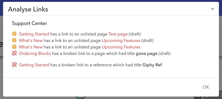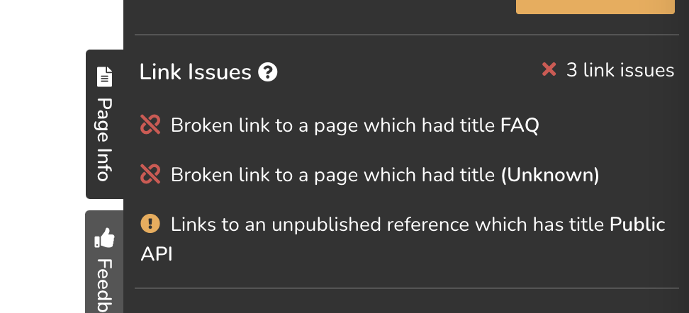If a link between pages or references is unreachable, then you will be notified below the page title of the link analysis results. Link analysis runs automatically every time a page loads.
