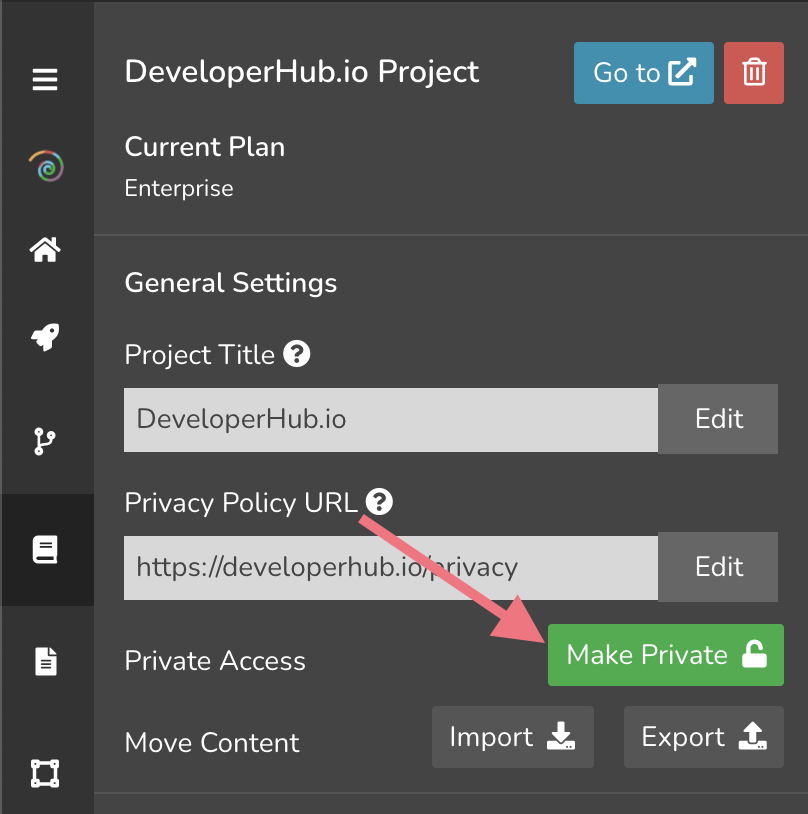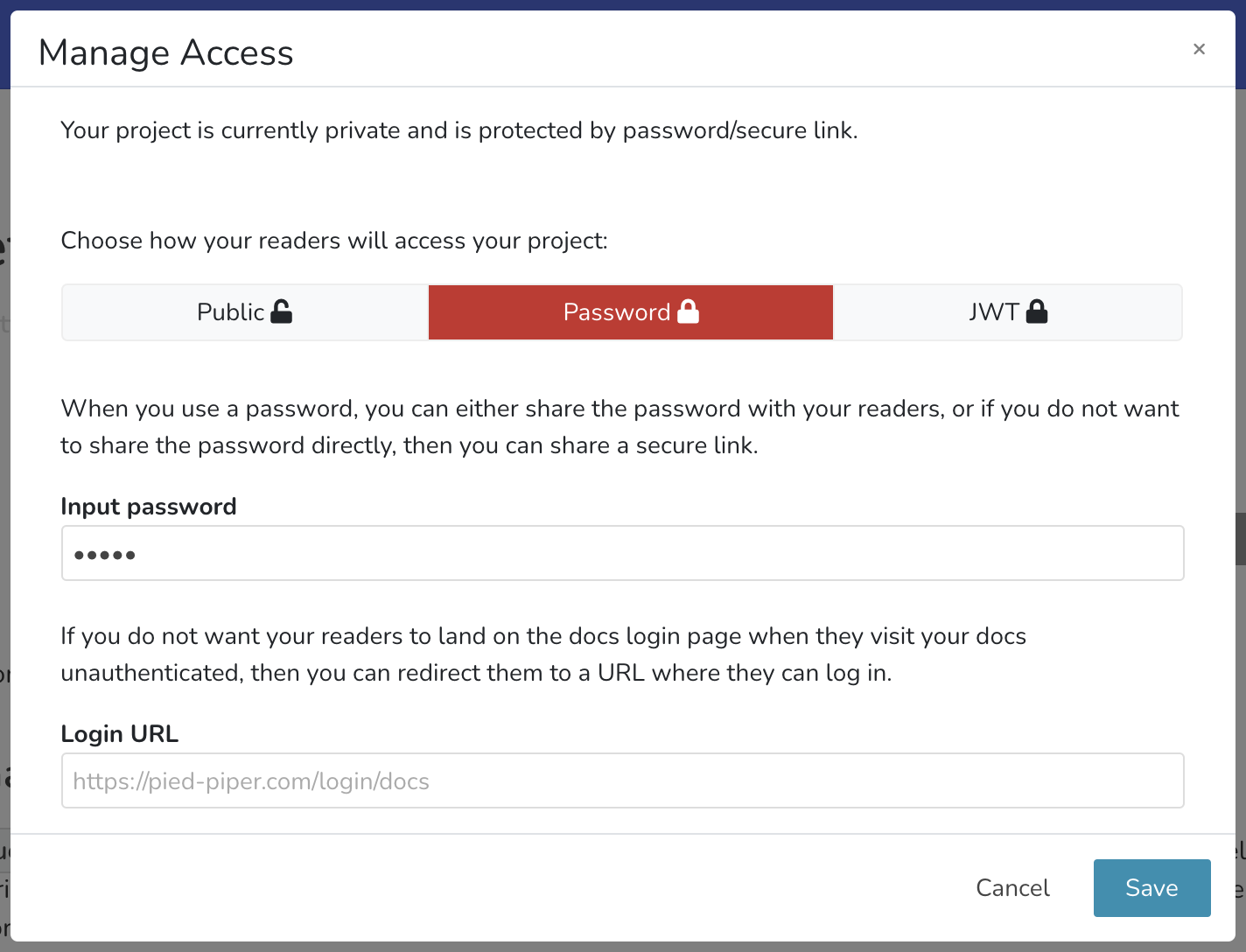 Supercharged plans admins can set their documentation portal as private, disallowing everyone on the internet to be able to access it. The protected project can be viewed by: