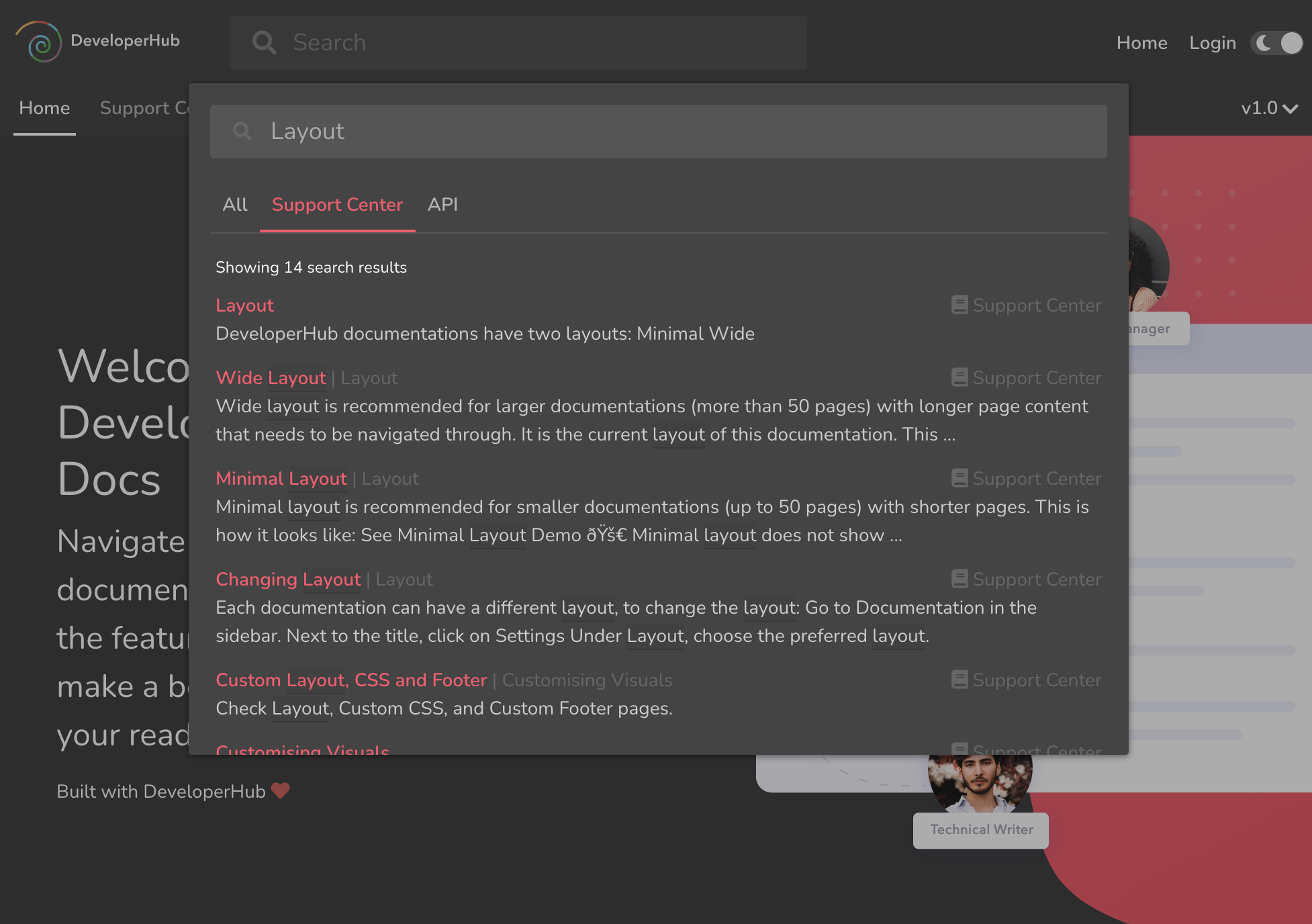 If you wish to provide documentation search capabilities outside of DeveloperHub, you can use our SearchAPI to make queries and direct your users to the relevant documentation. An example search request would look like: