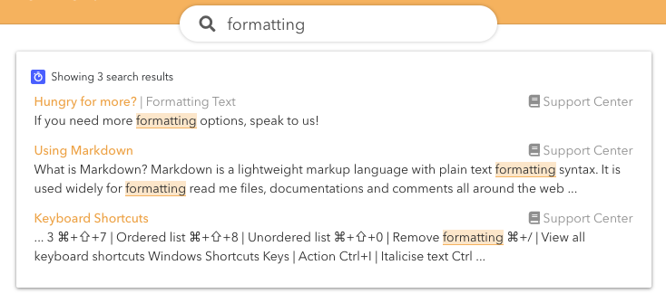 - Standard Search: Lightning-fast search service available for all paid plans. The search looks through each section of the documentation and links to it directly if a hit has been found. Typos are forgiven as well.